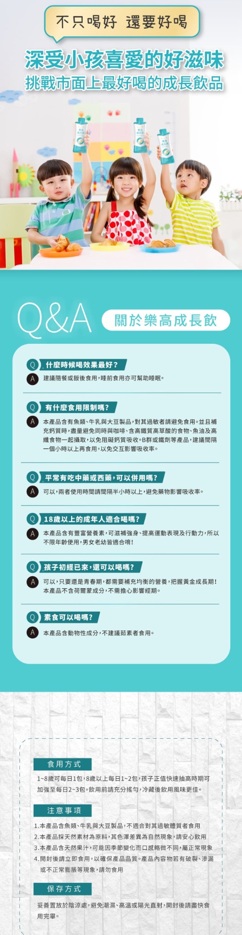 食用方法:1~8歲可每日一包,8歲以上每日1~2包,孩子正值快速抽高時期可加強至每日2~3包。飲用前請充分搖勻,冷藏後飲用風味更佳