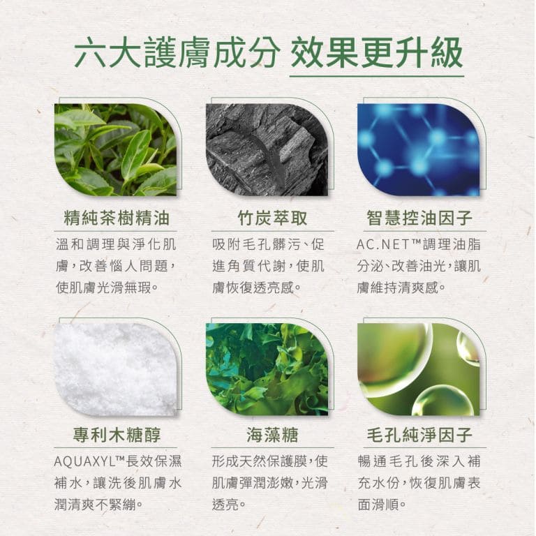 主成分:椰油胺基酸萃取、茶樹精油、竹炭、智慧控油因子AC.NET™、專利木糖醇AQUAXYL™、薄荷、洋甘菊萃取、奇異果萃取、MOIST™ 24 保濕因子(白茅萃取) 、毛孔純淨因子(糖海帶萃取)。
