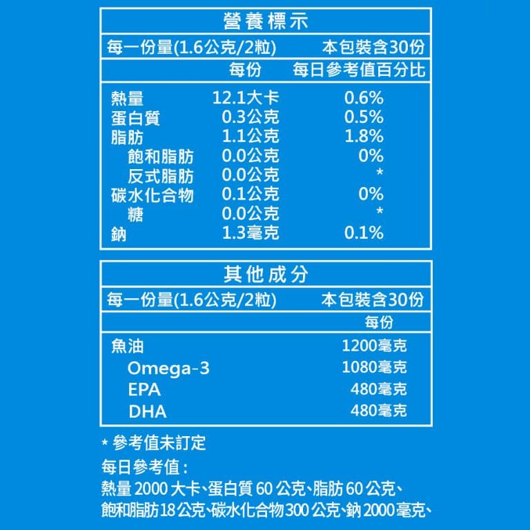 主成分(每包):魚油 (含魚油(含Omega-3脂肪酸)、混合濃縮生育醇(抗氧化劑))